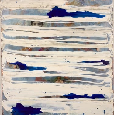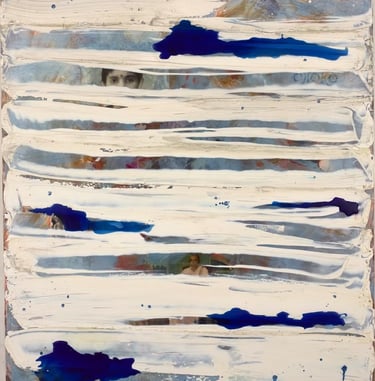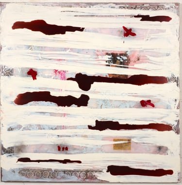 Des lignes blanches, horizontales, s’inscrivent comme des empreintes. Dans « Traces », le geste devient mémoire
